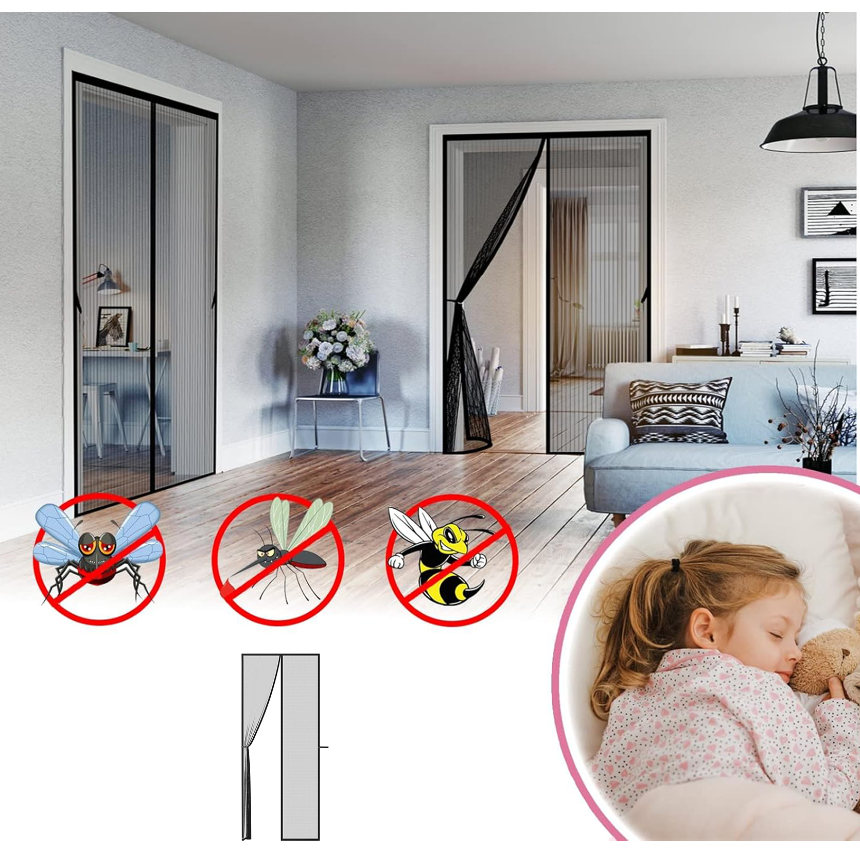 Strong built-in magnets ensure the curtain closes instantly after passing through, keeping insects out while allowing easy hands-free entry—perfect for kids and pets.
