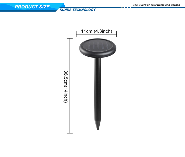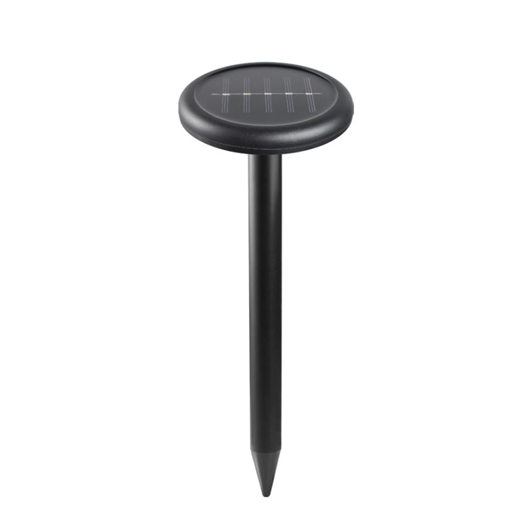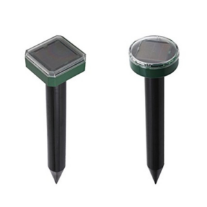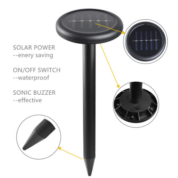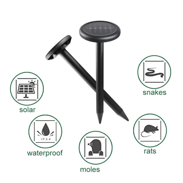 A device powered by solar energy, making use of sound waves and vibration to repel harmful rodents (moles, voles, snakes etc.) The sound waves will irritate them, simulate danger, and repel them away from the irradiated area.