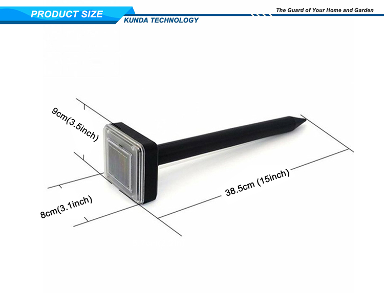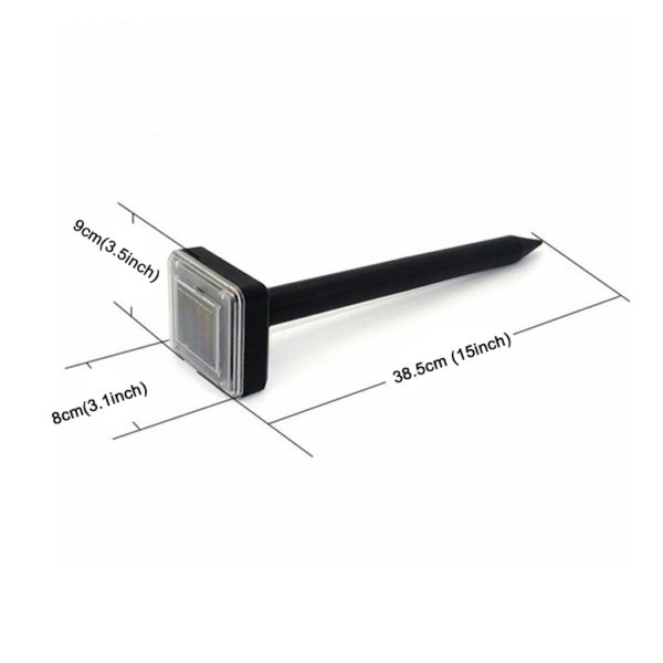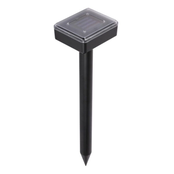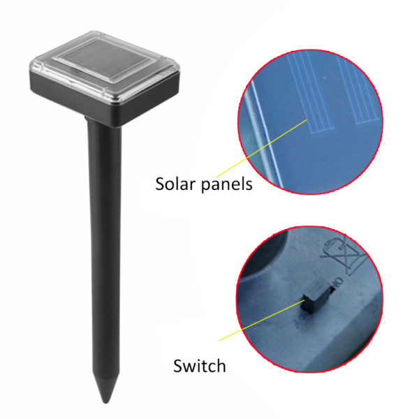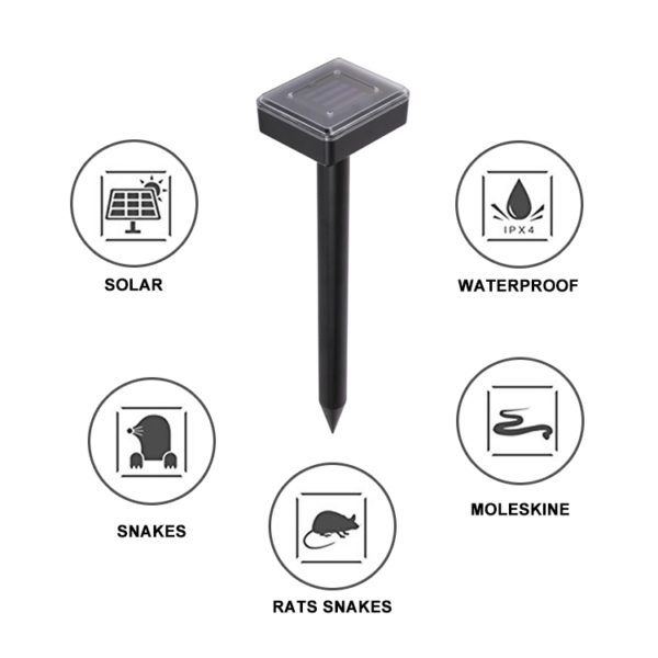 A device powered by solar energy, making use of sound waves and vibration to repel harmful rodents (moles, voles, snakes etc.) The sound waves will irritate them, simulate danger, and repel them away from the irradiated area.